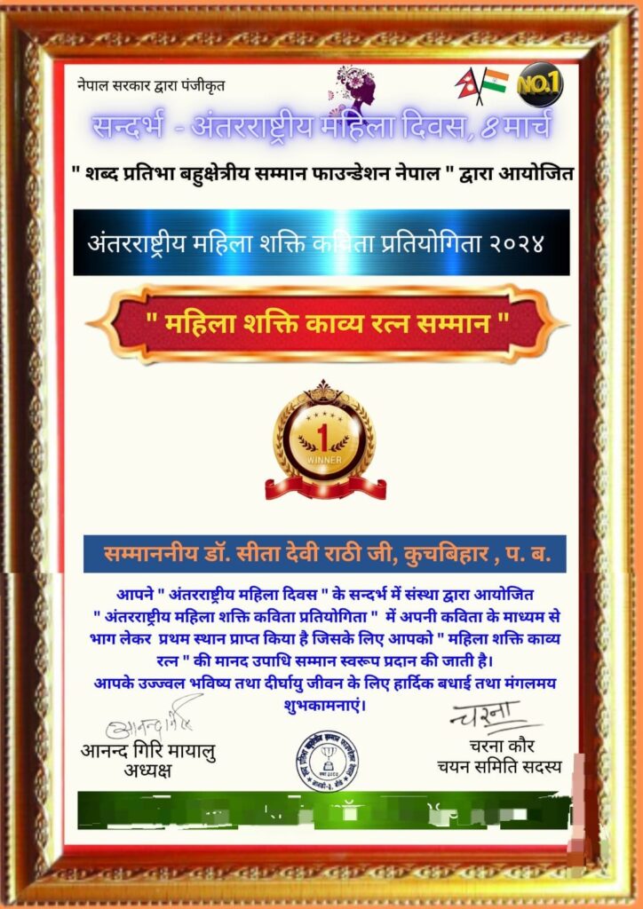 इस सम्मान से पूर्व भी कई राष्ट्रीय एवं अंतरराष्ट्रीय पुरस्कार प्राप्त लेखिका राठी को अभी हाल ही नेपाल की प्रसिद्ध साहित्यिक संस्था शब्द प्रतिभा बहू क्षेत्रीय सम्मान फाउंडेशन नेपाल द्वारा 8 मार्च को अंतरराष्ट्रीय महिला दिवस के अवसर पर आयोजित अंतर्राष्ट्रीय महिला शक्ति कविता प्रतियोगिता 2024 में प्रथम स्थान प्राप्त करने पर डॉ सीता देवी राठी को “अंतरराष्ट्रीय महिला शक्ति काव्य रत्न” की उपाधि से भी सुशोभित किया गया।