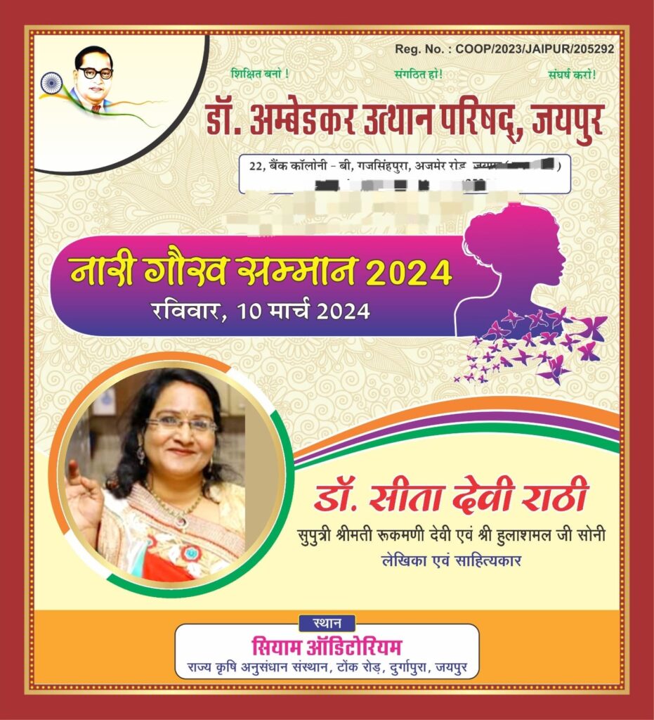 डां.अंबेडकर उत्थान परिषद जयपुर के सचिव सुखराज वर्मा ने बताया कि देश के अलग-अलग राज्यों की महिला शक्ति को शिक्षा, चिकित्सा, विधि सेवा, पत्रकारिता व अन्य क्षेत्र में विशेष योगदान करने पर सम्मान किया गया है। जिनमें श्रीडूंगरगढ़ की बेटी कुचबिहार निवासी डॉ. सीता देवी राठी को उनकी महत्वपूर्ण साहित्यिक कृतियों के लिये नारी गौरव सम्मान 2024 प्रदान किया गया।