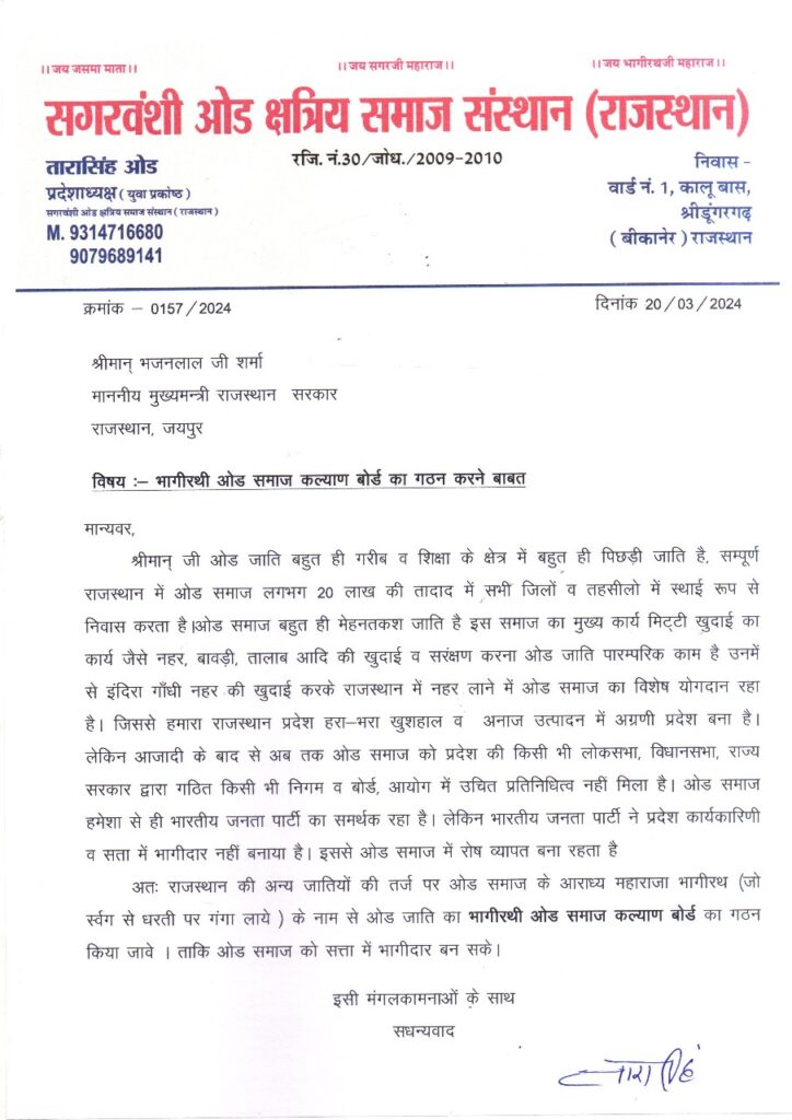 सगरवंशी ओड क्षत्रिय समाज संस्थान के युवा प्रकोष्ठ के प्रदेशाध्यक्ष तारासिंह ओड ने राजस्थान सरकार के मुख्यमंत्री भजनलाल शर्मा को पत्र लिखते हुए मांग की कि ओड क्षत्रिय समाज गरीब, अशिक्षित और अति पिछड़ा है। इसके सुधार के लिए बोर्ड का गठन किया जाए जिससे समाज उन्नति कर सके।