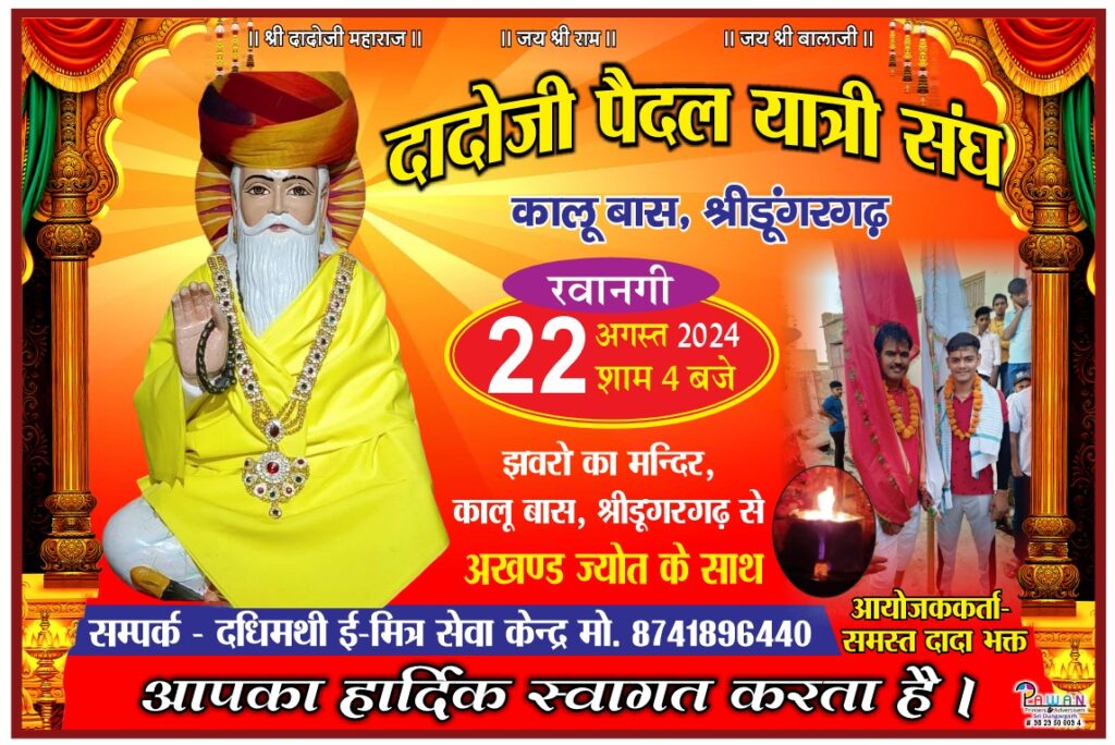 The Khabar Xpress 22 जुलाई 2024। श्रीडूंगरगढ़ का पहला परसनेऊ दादोजी पैदल यात्री संघ 22 अगस्त 2024 को शाम 4 बजे कालूबास झंवरो के मंदिर से रवाना होगा। नितेश आसोपा और कालूराम शर्मा ने बताया कि ये परसनेऊ जाने वाला ये प्रथम संघ है जो लगातार दादोजी के दर्शनार्थ पैदल जा रहा है।