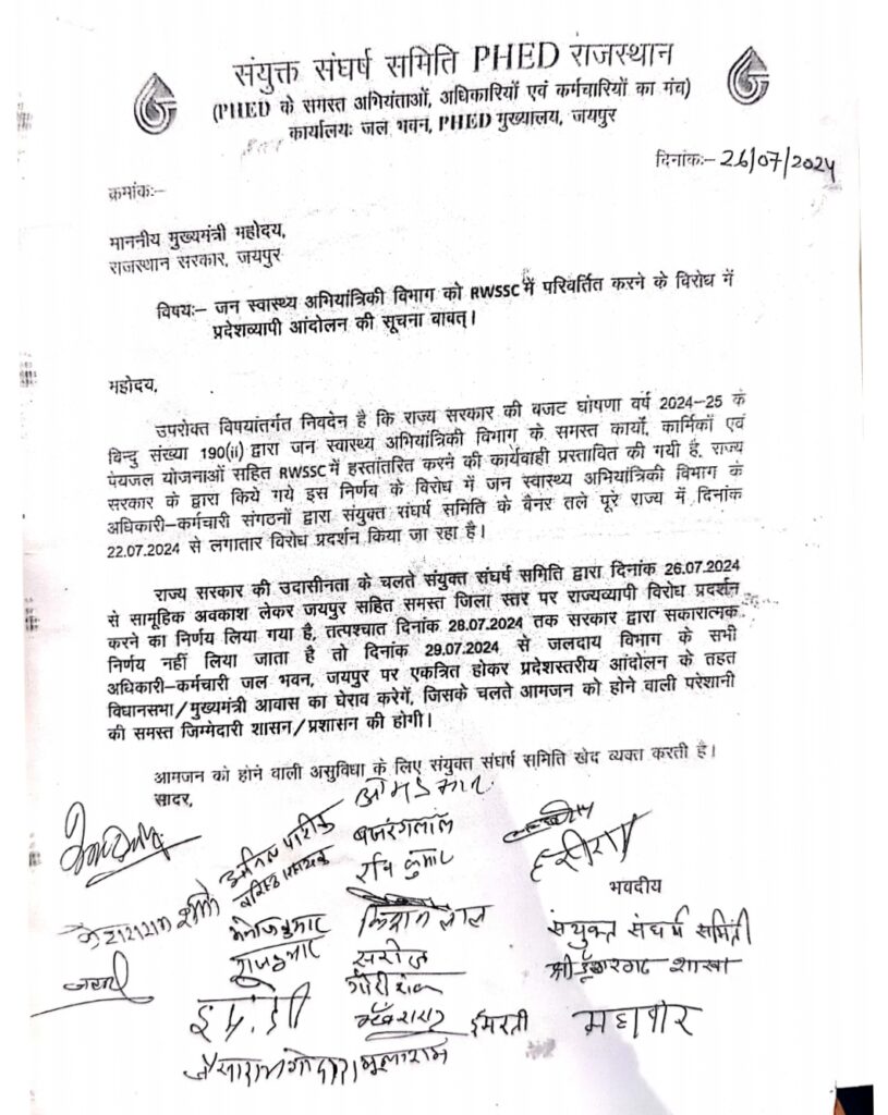 The Khabar Xpress 26 जुलाई 2024। जलदाय विभाग के कार्यों को आरडब्ल्यूएसएससी को हस्तांरित करने का विरोध मुखर होने लगा है। संयुक्त संघर्ष समिति PHED राजस्थान के बैनर तले आज श्रीडूंगरगढ़ शाखा के जलदाय विभाग के कार्मिकों ने उपखण्ड अधिकारी श्रीमती उमा मित्तल को मुख्यमंत्री के नाम ज्ञापन सौंपा। समिति के सदस्यों ने बताया कि राज्य सरकार की बजट घोषणा वर्ष 2024-25 के बिंदु संख्या 190 (i) द्वारा जन स्वास्थ्य अभियांत्रिकी विभाग के समस्त कार्यों, कार्मिकों एवं पेयजल योजनाओं सहित RWSSC में हस्तांतरित करने की कार्यवाही प्रस्तावित की गयी है। राज्य सरकार के द्वारा किये गये इस निर्णय के विरोध में जन स्वास्थ्य अभियांत्रिकी विभाग के अधिकारी-कर्मचारी संगठनों द्वारा संयुक्त संघर्ष समिति के बैनर तले पूरे राज्य में दिनांक 22.07.2024 से लगातार विरोध प्रदर्शन किया जा रहा है। आज 26 जुलाई को सामुहिक अवकाश लेकर संयुक्त संघर्ष समिति द्वारा जयपुर सहित समस्त जिला स्तर पर राज्यव्यापी विरोध प्रदर्शन करने का निर्णय लिया गया है। विभाग के कार्मिक राजकुमार तावणियाँ ने बताया कि अगर सरकार द्वारा 28 जुलाई तक कोई सकारात्मक कदम नही उठाया जाता है तो समिति के बैनर तले 29 जुलाई को प्रदेश स्तरीय आंदोलन किया जाएगा। कार्मिक मनोज कुमार नाई ने बताया कि आरडब्ल्यूएसएससी की हालत संभवतया इन सभी निगमों से भी दयनीय और अधिक खराब है। ऐसे में कर्मचारियों का मासिक वेतन, पेंशन भुगतान भी समय पर होना असंभव है, जिससे कर्मचारियों एवं उनके परिवार की आजीविका पर संकट खड़ा होने की आशंका है। राज्य में पेयजल आपूर्ति से जुड़े कार्यों को निगम को हस्तांरित किए जाने का निर्णय राज्य के आम नागरिकों, विभागीय कर्मचारियों और राज्य सरकार के भी हित में नहीं है। इस दौरान ओमप्रकाश, बजरंग लाल, रविकुमार, सरोज, इंदु देवी, हरीराम, गौरीशंकर सहित श्रीडूंगरगढ़ जलदाय विभाग के कार्मिक मौजूद रहे।