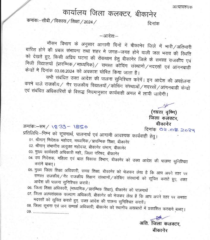 The Khabar Xpress 02 अगस्त 2024। मौसम विभाग के अनुसार आगामी दिनों में बीकानेर जिले में भारी/अतिभारी बारिश होने की प्रबल संभावना तथा इस कारण जलभराव की संभावित स्थिति को देखते हुए जिले के समस्त राजकीय एवं निजी (प्रारम्भिक/माध्यमिक) विद्यालयों, समस्त कोचिंग संस्थानों, मदरसो एवं आंगनबाड़ी केन्द्रों में शनिवार को अवकाश रहेगा। जिला कलक्टर नम्रता वृष्णि ने इस संबंध में आदेश जारी किया है। आदेश अनुसार सभी को इस की पालना सुनिश्चित करनी होगी। अवहलेना करने वाले संस्थानों और अधिकारियों के विरूद्ध नियमानुसार कार्यवाही अमल में लाई जाएगी।
