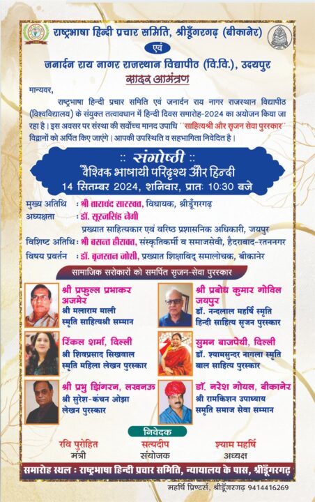 The Khabar Xpress 12 सितंबर 2024। राष्ट्रभाषा हिन्दी प्रचार समिति, श्रीडूंगरगढ ने हिन्दी सृजन हेतु दिए जाने वाले राष्ट्रीय पुरस्कारों की घोषणा कर दी है। 14 सितम्बर को सभी घोषित पुरस्कार समिति भवन में प्रदान किये जायेंगे।