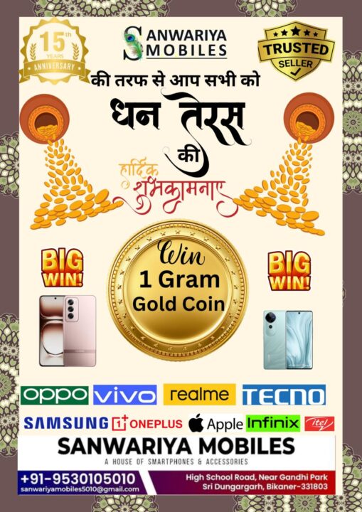 सांवरियां मोबाइल के प्रोपराइटर राधे बाहेती ने दीपावली की शुभकामनाएं देते हुए बताया कि स्थापना के 15वें वर्ष पर दीपावली के इस पावन पर्व उनकी तरफ से अपने ग्राहकों को लाखों रुपये नगद जितने का अवसर मिलेगा साथ ही एक भाग्यशाली ग्राहक को मिलेगा एक ग्राम सोने का सिक्का जीतने का मौका।
