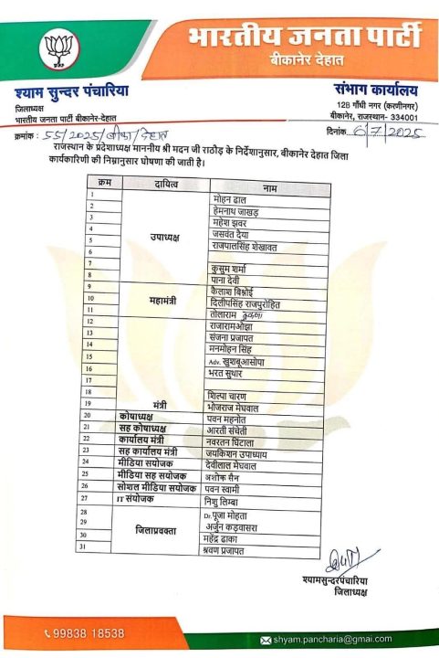 The Khabar Xpress 06 जुलाई 2025। भाजपा देहात बीकानेर के जिलाध्यक्ष श्यामसुंदर पंचारिया ने प्रदेशाध्यक्ष मदन राठौड़ के निर्देशानुसार देहात भाजपा कार्यकारिणी घोषित कर दी। इस 31 सदस्य कार्यकारिणी में श्रीडूंगरगढ़ से जिला उपाध्यक्ष हेमनाथ जाखड़, कुसुम शर्मा एवं पार्षद भरत सुथार को जिलामंत्री बनाया गया। कार्यालय मंत्री नवरतन घिंटाला और अशोक सैम को मीडिया सहसंयोजक बनाया गया। श्रीडूंगरगढ़ विधायक ताराचंद सारस्वत, श्रीविश्वकर्मा कौशल विकास बोर्ड के अध्यक्ष रामगोपाल सुथार, बृजलाल तावणियाँ, नगरपालिका अध्यक्ष मानमल शर्मा, भाजपा नेता शिवप्रसाद तावणियाँ सहित अनेक भाजपा नेताओं ने सभी नवनियुक्त पदाधिकारियों को शुभकामनाएं दी।
