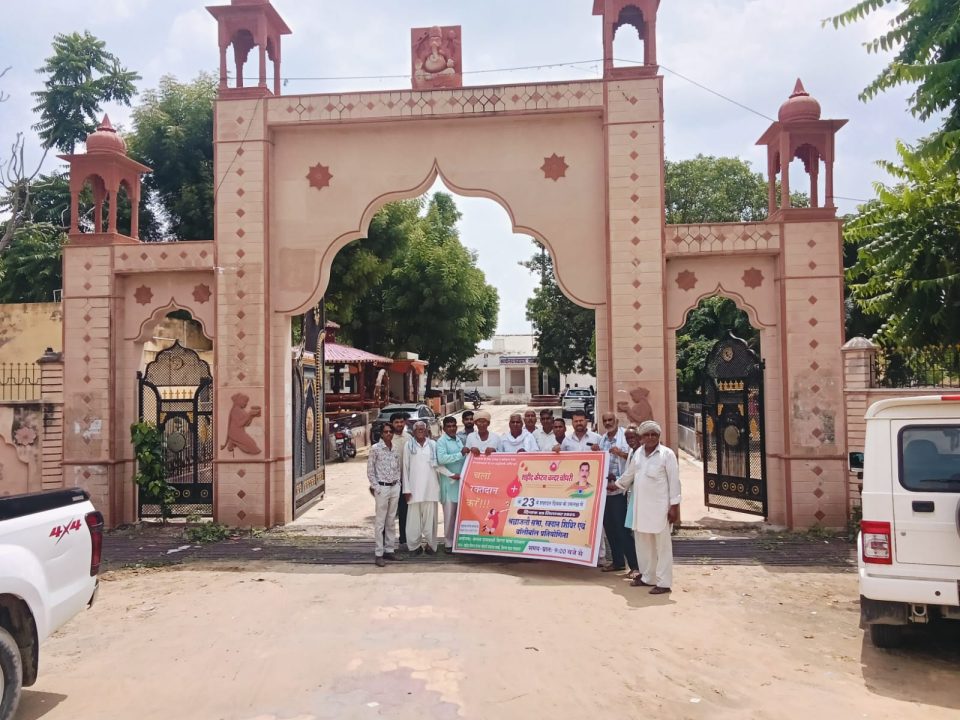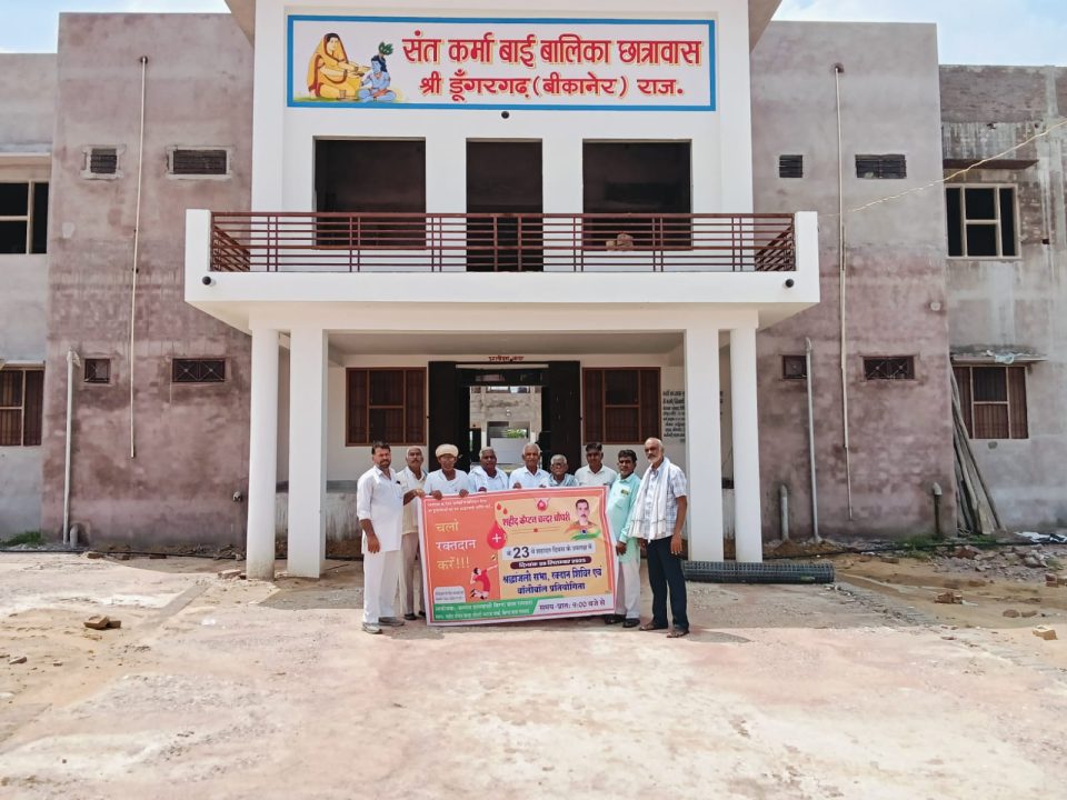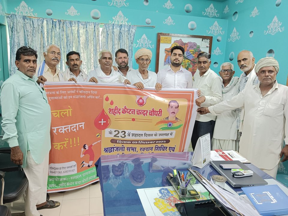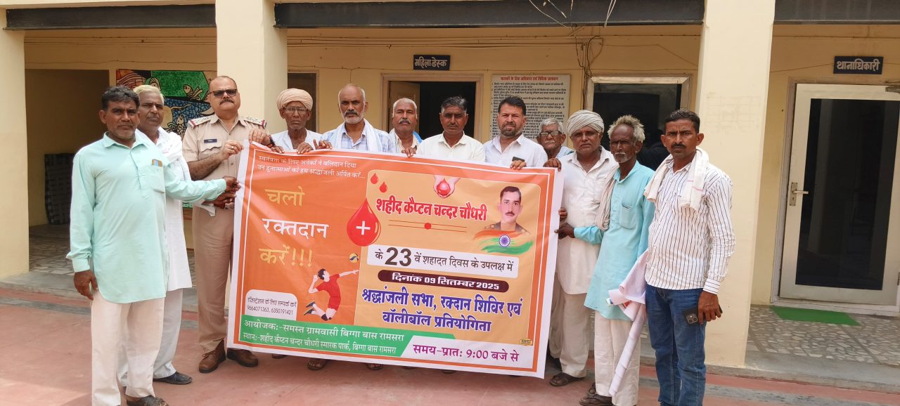 The Khabar Xpress 03 सितंबर 2025। श्रीडूंगरगढ़ के बिग्गा रामसरा के शहीद कैप्टन चंदर चौधरी के 23वें बलिदान दिवस 9 सितंबर को श्रद्धांजलि सभा एवं रक्तदान शिविर का आयोजन किया जायेगा। इसकी जानकारी देते हुए सीताराम सियाग ने बताया कि आज बुधवार को श्रीडूंगरगढ़ उपखण्ड अधिकारी शुभम शर्मा द्वारा रक्तदान शिविर के पोस्टर का विमोचन किया गया। इस अवसर पर उपखण्ड अधिकारी शुभम शर्मा ने कहा कि शहीद को सच्ची श्रद्धांजलि उसके जीवन से प्रेरणा लेकर ही दी जा सकती है। रक्तदान कर युवा अपने क्षेत्र के हीरो को अपनी आदरांजलि दे सकते है एवं समाजहित में अपनी अग्रणी भूमिका निभा सकते हैं। सामाजिक कार्यकर्ता हरिओम तावणियाँ ने क्षेत्र के युवाओं से अधिक से अधिक रक्तदान करने का आह्वान किया। इस दौरान सरपंच लक्ष्मण राम, चतराराम सारण, मदनलाल आचार्य, हनुमान राम नाई, नारायण गिला, हनुमान राम जाखड़, भैराराम जाखड़, बेगाराम जाखड़, मांगीलाल सियाग उपस्थित रहे।