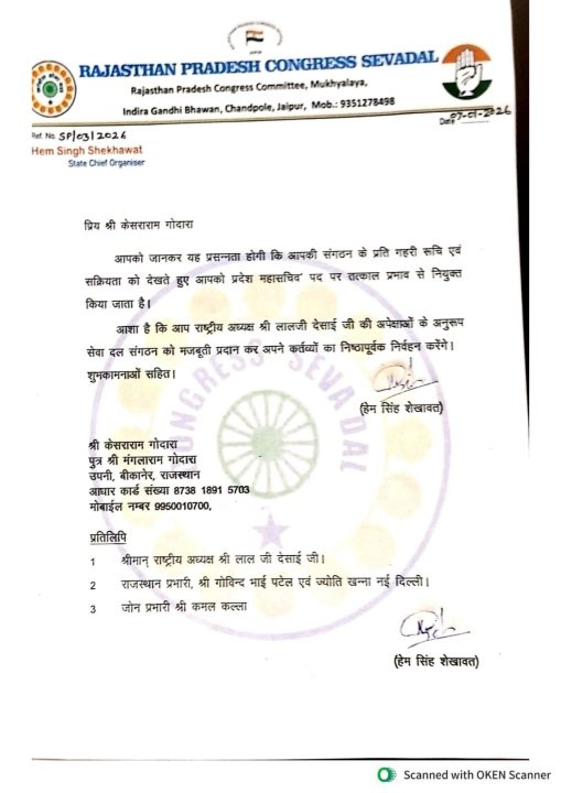 The Khabar Xpress 08 जनवरी 2026। श्रीडूंगरगढ़ के पूर्व विधायक मंगलाराम गोदारा के पुत्र पूर्व उपप्रधान एवं बीकानेर देहात कांग्रेस के जिला उपाध्यक्ष केसराराम गोदारा को राजस्थान प्रदेश कांग्रेस सेवादल के जोन प्रभारी कमल कल्ला, राजस्थान प्रभारी गोविंद भाई पटेल व ज्योति खन्ना की अनुशंसा पर सेवादल के राष्ट्रीय अध्यक्ष लालजी देसाई के निर्देश पर राजस्थान कांग्रेस सेवादल के प्रदेशाध्यक्ष हेमसिंह शेखावत ने राजस्थान कांग्रेस सेवादल का प्रदेश महासचिव नियुक्त किया है। गोदारा ने पूर्व मुख्यमंत्री अशोक गहलोत, प्रदेशाध्यक्ष गोविंदसिंह डोटासरा एवं सेवादल के प्रदेशाध्यक्ष हेमसिंह शेखावत का आभार प्रकट किया। और विश्वास दिलाया कि क्षेत्र में कांग्रेस पार्टी की रीति नीति का प्रसार करते हुए क्षेत्र की जनसमस्याओं पर जनता की आवाज़ बनेंगे।