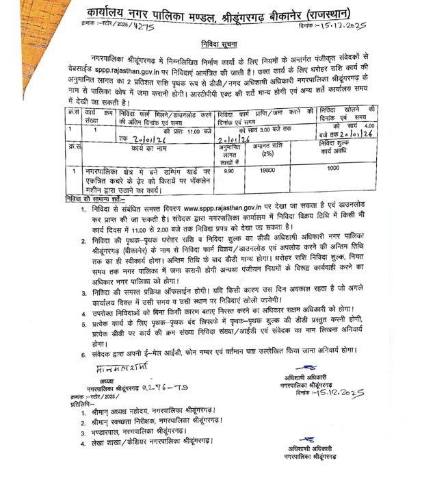 अभी वर्तमान में श्रीडूंगरगढ़ नगरपालिका द्वारा संचालित डंपिंग ग्राउंड में असंख्य गौवंश की अकाल मौत का मामला सुर्खियों में रहा है। नगरपालिका प्रशासन द्वारा इस पूरे प्रकरण में ढिलाई बरती गई और गौसेवकों को मृत गौवंश के पोस्टमार्टम के लिये में भी न्यायालय की शरण मे जाना पड़ा और न्यायपालिका ने पोस्टमार्टम के आदेश भी जारी कर दिए। नगरपालिका श्रीडूंगरगढ़ ने इस पूरे प्रकरण को आपदा में अवसर की तरह लिया। सम्पूर्ण कस्बे सहित पूरे क्षेत्र में पता है कि इस घटना के तुरंत बाद ही नगरपालिका ने डंपिंग ग्राउंड पर पोकलेन मशीन द्वारा सड़क किनारे फैले कचरे को अंदर धकेलना शुरू कर दिया था। लेकिन आज इतने दिनों के बाद नगरपालिका श्रीडूंगरगढ़ द्वारा गत 15 जनवरी को श्रीडूंगरगढ़ नगरपालिका ने क्षेत्र में बने डंपिंग यार्ड पर एकत्रित कचरे के ढेर को किराए पर पोकलेन मशीन द्वारा उठाने की निविदा जारी की। निविदा में निविदा फॉर्म मिलने, निविदा जमा करने एवं निविदा खोलने की तारीख 20 जनवरी लिखी है। कितना बड़ा भ्रष्टाचार है कि जो काम पहले ही हो चुका है उसकी निविदा अब जारी की गई है और निविदा के लिए सिर्फ एक ही दिन का समय दिया गया है।
