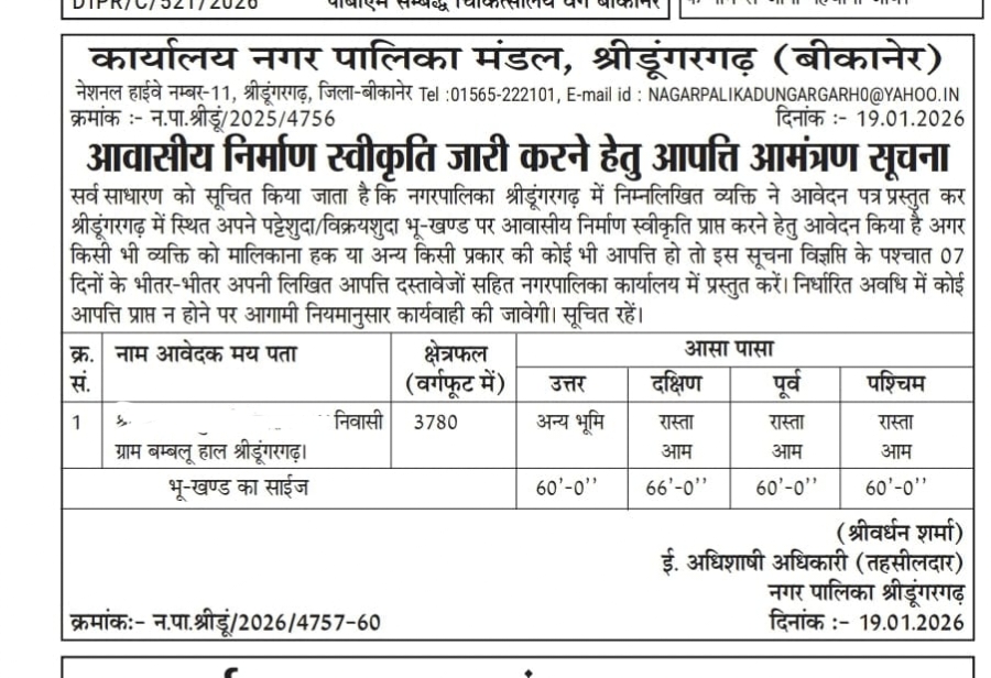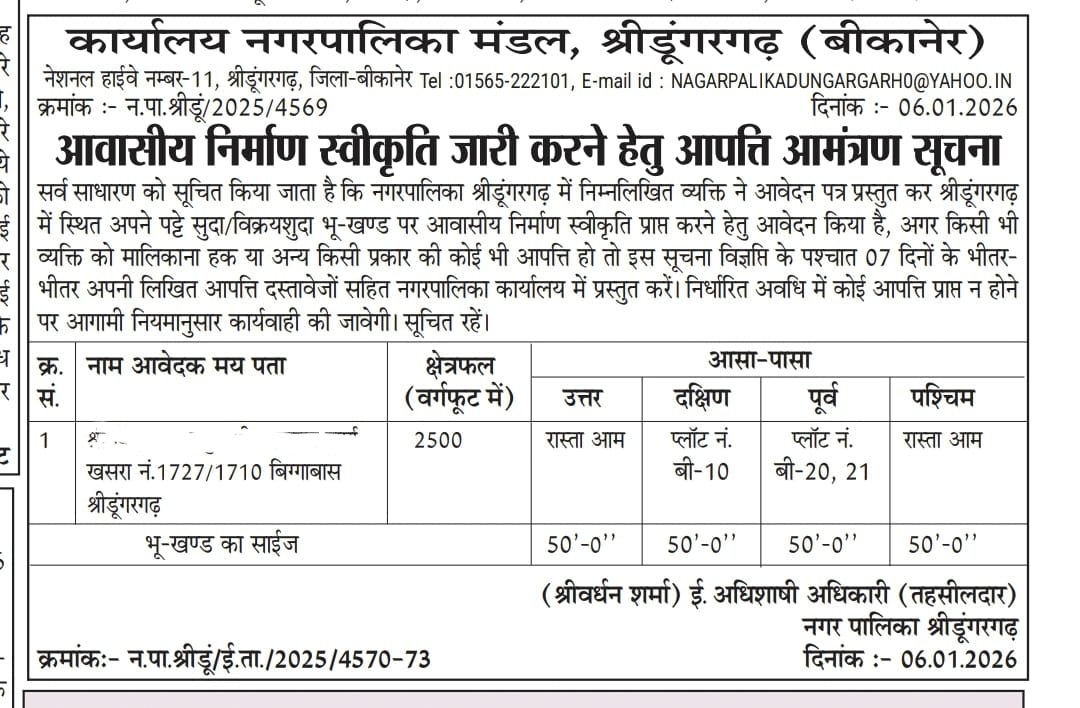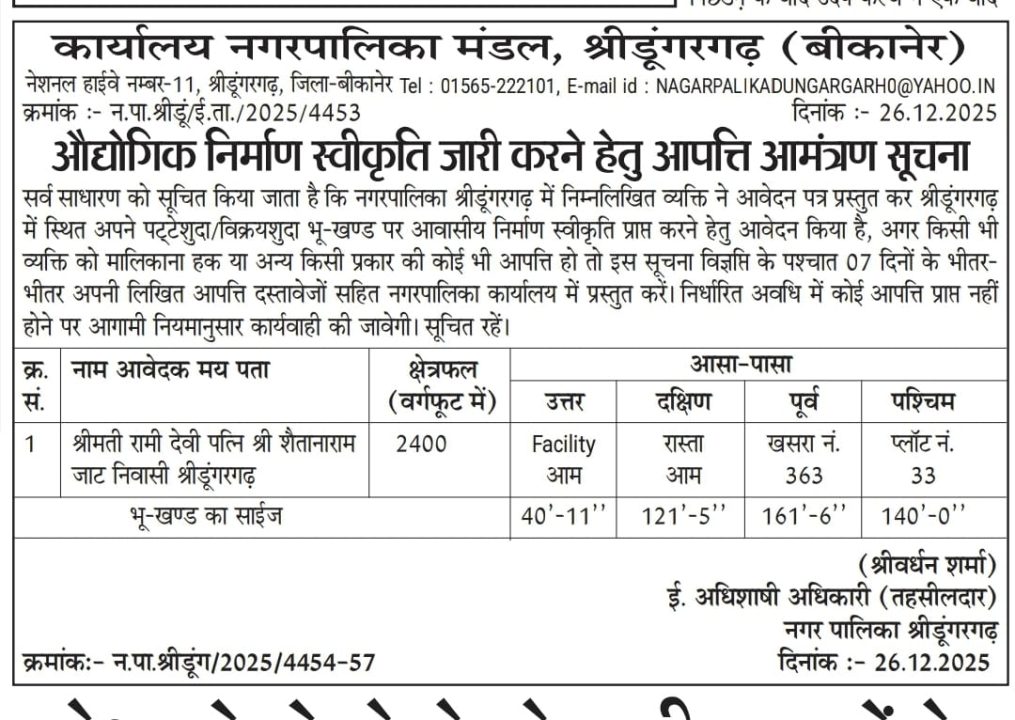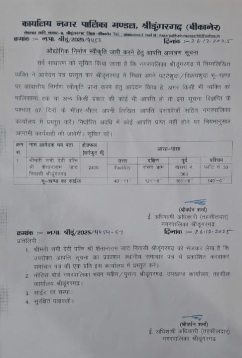 ताज़ा मामला सामने आया है कि नगरपालिका श्रीडूंगरगढ़ के अधिशाषी अधिकारी श्रीवर्धन शर्मा ने गत 26 दिसम्बर 2025 को औद्योगिक निर्माण स्वीकृति जारी करने हेतु एक आपत्ति आमंत्रण सूचना जारी की है। जिसकी हेडलाइन तो औद्योगिक निर्माण की है परंतु बताया ये गया है कि आवेदक ने आवासीय निर्माण की स्वीकृति प्राप्त करने हेतु आवेदन लगाया है।