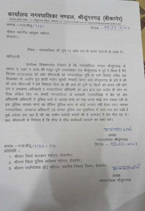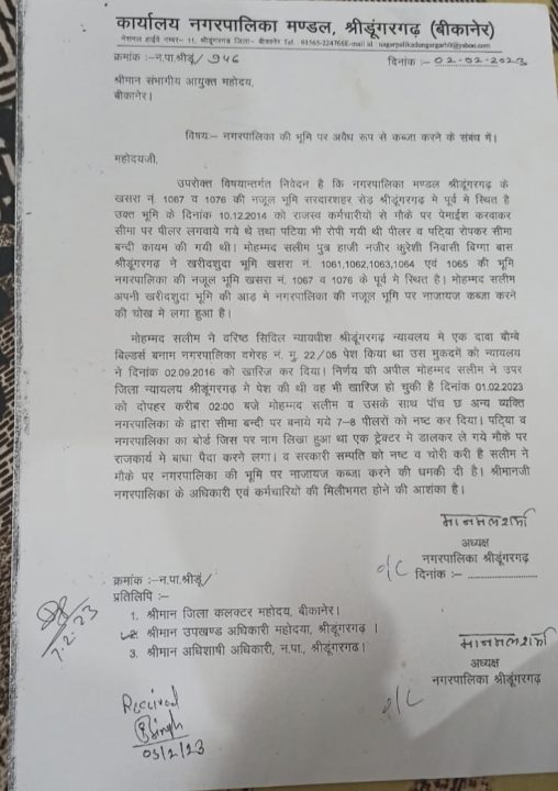 इस पूरे प्रकरण में बड़ी जानकारी सामने आई है कि इस कॉलोनी के कॉलोनाइजर सलीम के खिलाफ श्रीडूंगरगढ़ नगरपालिका के चेयरमैन मानमल शर्मा ने बीकानेर संभागीय आयुक्त एवं जिला कलेक्टर को 2 फरवरी 2023 व 9 फरवरी 2023 को पत्र लिखकर नगरपालिका के खसरा 1067 व 1076 पर कॉलोनाइजर द्वारा अवैध कब्जा करने एवं उसको खाली करवाने की गुहार लगाई थी। फिर उस जमीन पर नगरपालिका द्वारा निशानदेही करके तारबंदी भी की गई थी।
